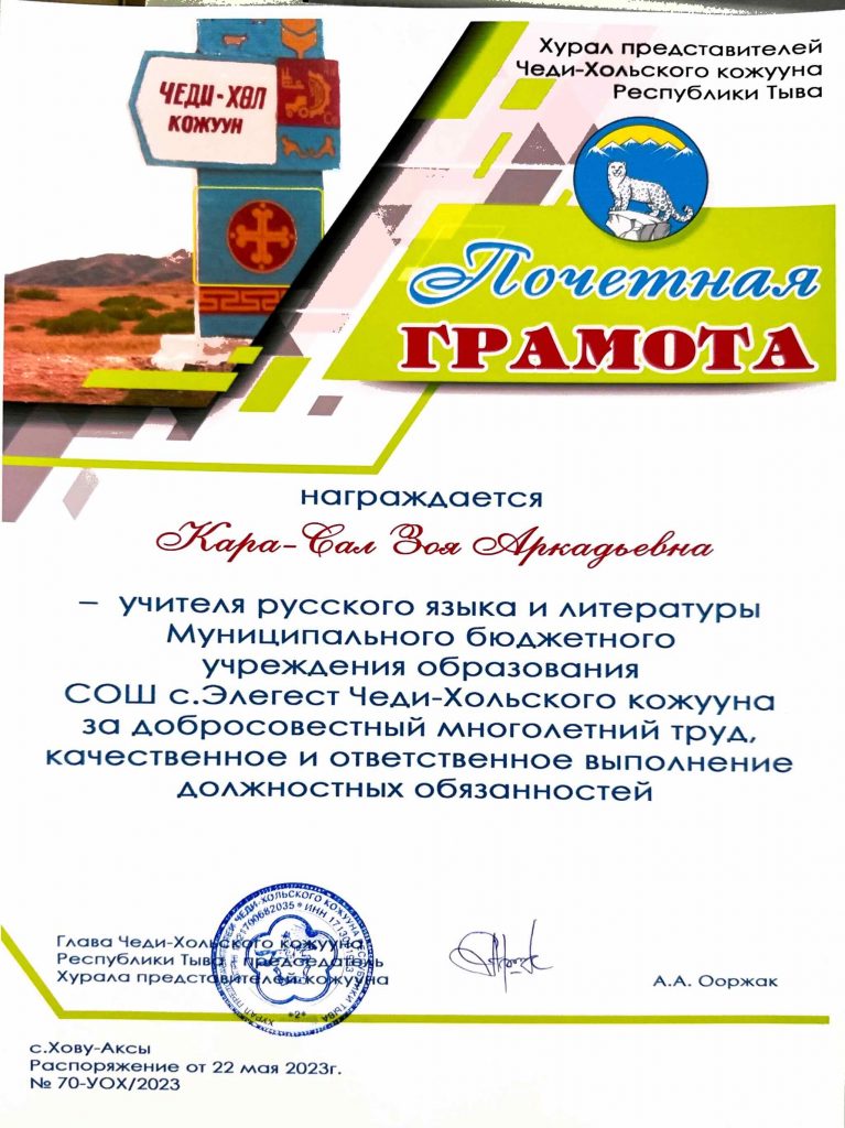 668336 Республика Тыва, с.Элегест, ул. Школьная 5