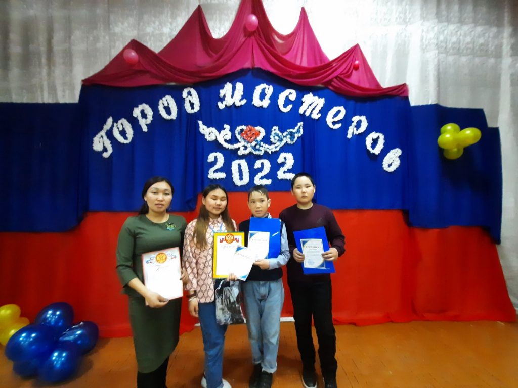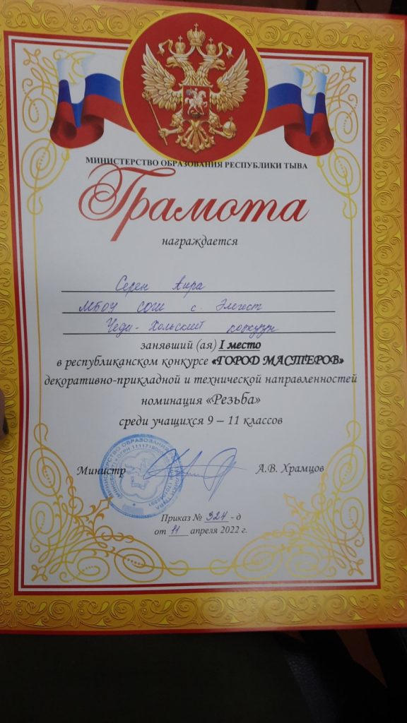 09 апреля 2022 года победители муниципального конкурса «ГОРОД МАСТЕРОВ» декоративно-прикладной направленности, участвовали в региональном этапе конкурса и были награждены сертификатами участников Министерства Образования Республики Тыва. Ученица 10 класса Серен Аира заняла 1 место в номинации «Резьба по камню»(Чонар-даш) среди учащихся 9-11 классов. Учащихся подготовила учитель технологии Сагар А.А.