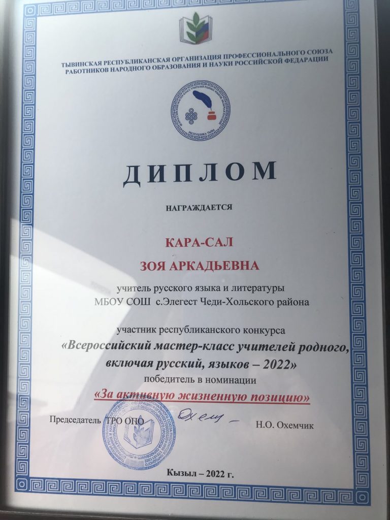 В Туве подвели итоги конкурса «Учитель года» -главного состязания педагогов, в котором учителя нашей школы Кара-Сал Зоя Аркадьевна, Шыгжал Аяна Викторовна приняли активное участие и награждены грамотами и дипломами РОПРОН РТ и Верховного Хурала РТ