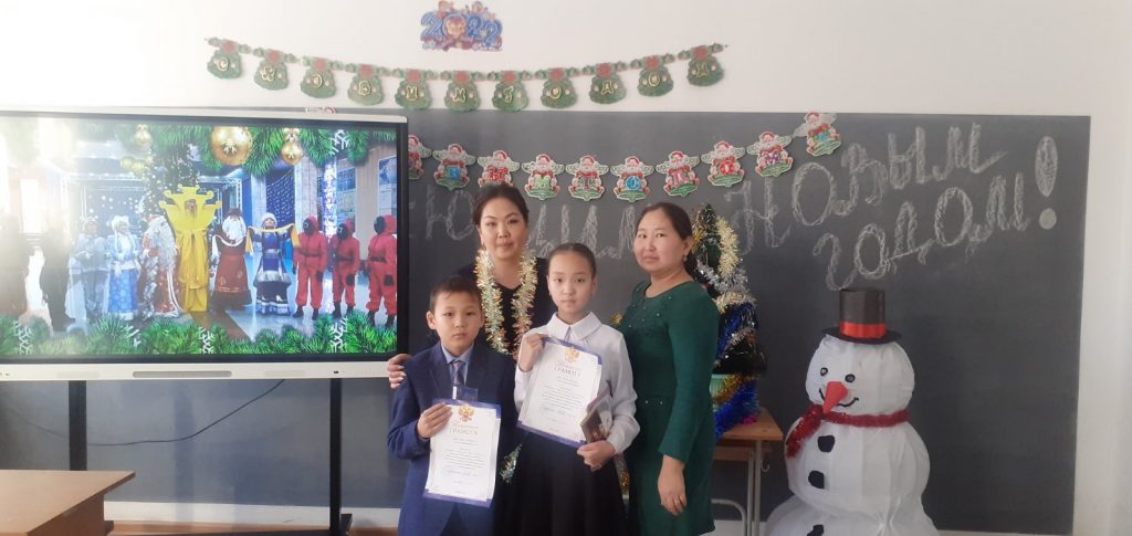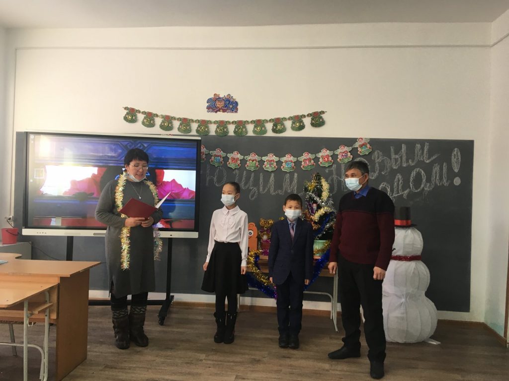 Учащимся, отличникам и активистам 4 класса Санчы Алдын-Кыс и Саая Айнур, Глава с.Элегест Монгуш Б.С. вручил новогодние подарки и памятные открытки от имени Президента РТ Ховалыг В.Т. На Главной Ёлке Главы РТ детям продемонстрировали спектакль-новогоднее представление артистов МДТ им. В.Ш. Кок-оола «Кто украл наш Новый год?». От имени директора и администрации школы детям вручены Почетные грамоты и сладкие подарки с поздравлениями. Желаем нашим активистам дальнейших успехов и крепкого здоровья.
